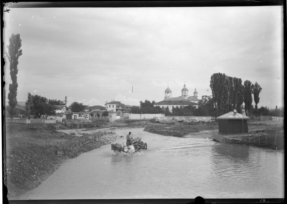 'Vy med vattendrag ev flod där 1 man är i färd med att gå över med ett oxspann, två oxar drar ett lass timmerstockar. I bakgrunden syns ev. kyrka. :: :: Ingår i serie med fotonr. 5280:1-17. Se även fotonr. 5269-5292 med bilder från Stuxbergs resa till Kaukasien.'