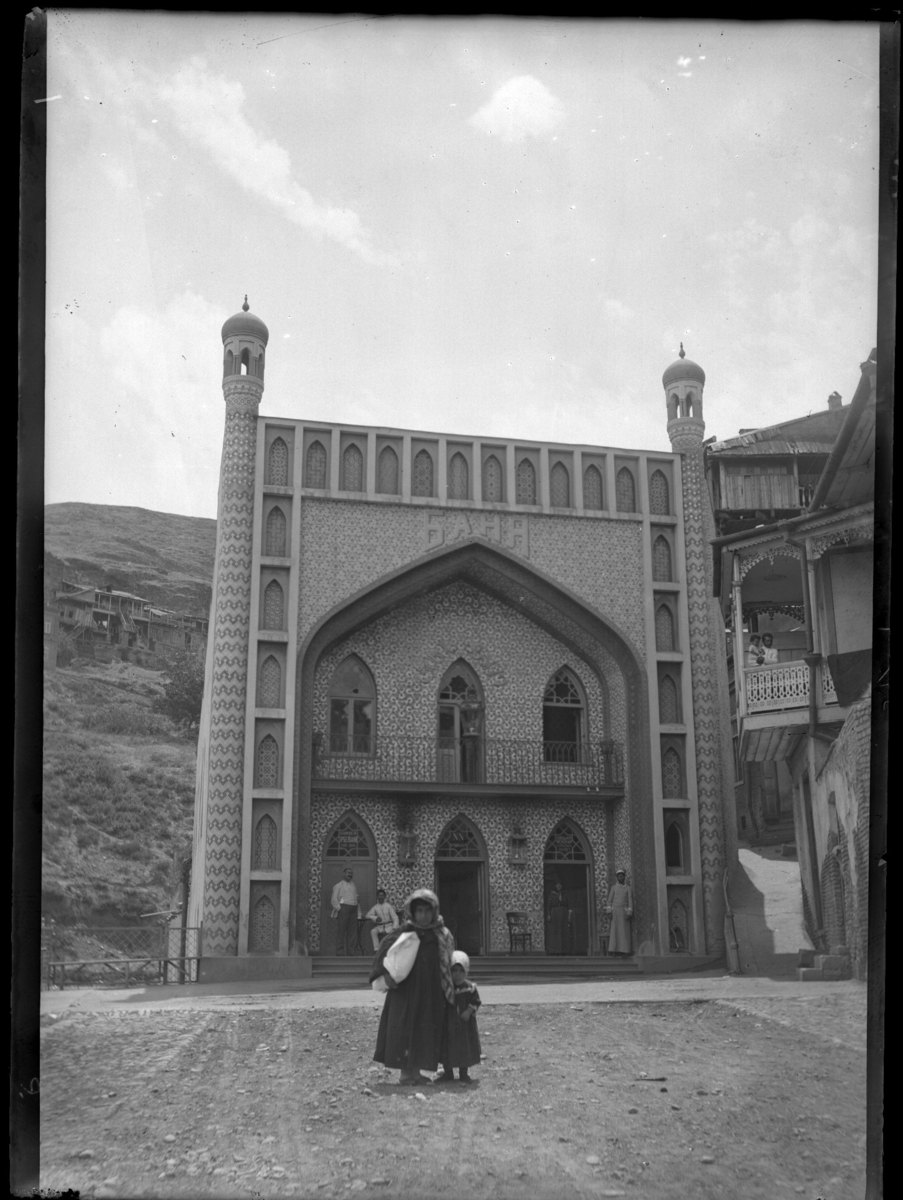 'Stor byggnad, hus, med gårdsplan framför. Barn, kvinnor och män framför huset. Byggnadsstil. Kläder. Klädsel. :: :: Ingår i serie med fotonr. 5275:1-21. Se även fotonr. 5269-5292 med bilder från Stuxbergs resa till Kaukasien.'