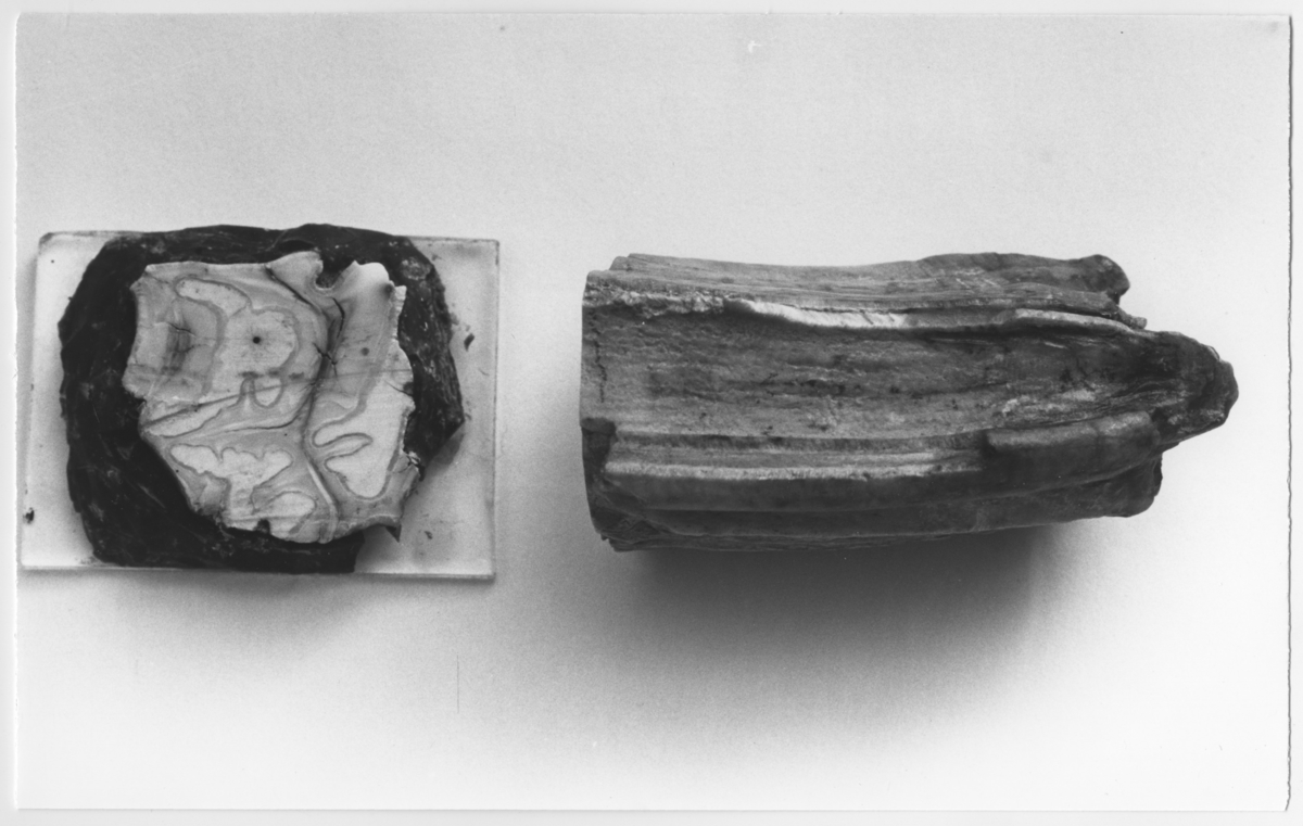 'Närbilder på tand, snitt samt sedd från sidan. Tand, 2:a eller 1:a molaren i höger överkäke. :: :: Ingår i serie med fotonr. 5634:1-6.'