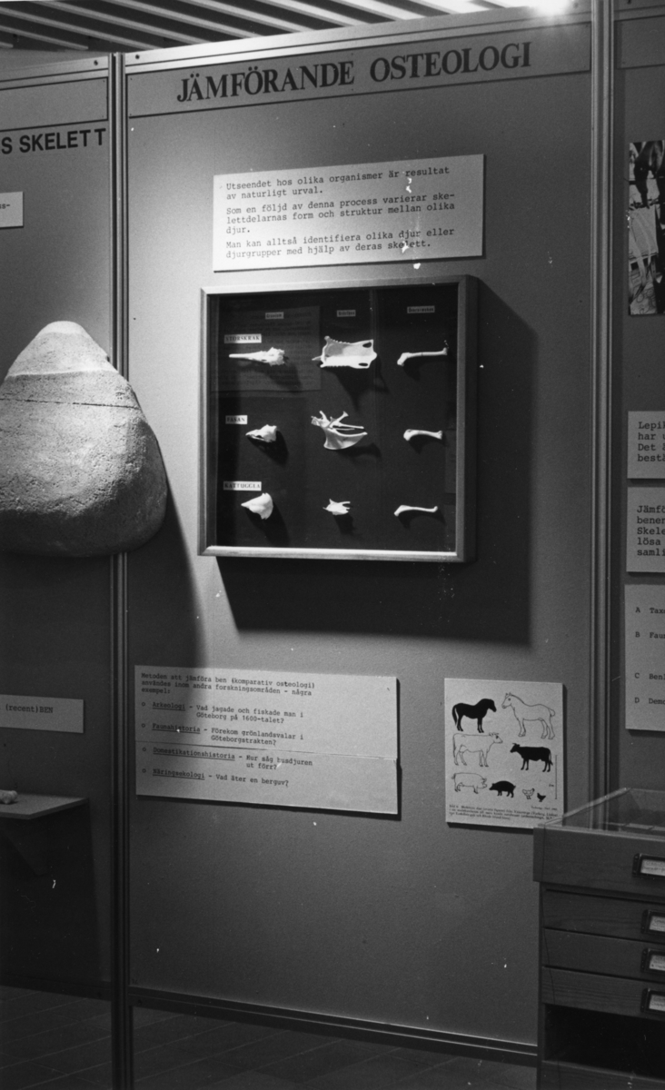 'Foto på Jubileumsutställningen, Göteborgs Naturhistoriska museum 150 år. :: :: Utställningsskärm angående jämförande osteologi, monter med jämförande benexempel från tre djurarter. Storskrak coll.au. 12.907, fasan Coll.au. 12.923, Kattuggla Coll.au 12.913.'
