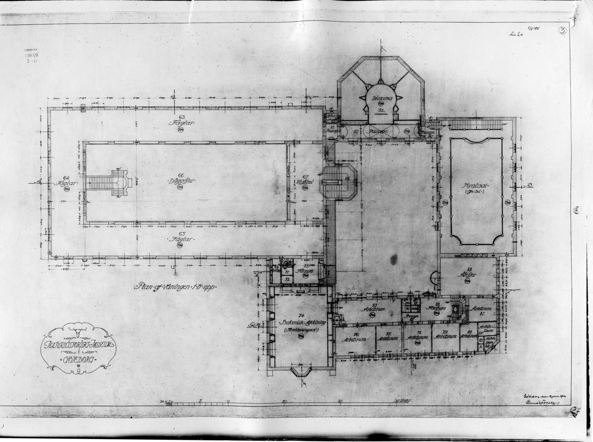 'Interiör: ''Plan af våningen 1tr upp''. :: :: Ingår i serie med fotonr. 6067:1-7 med planritningar, såväl exteriör som interiör, inför nybyggandet av Naturhistoriska Museet i Göteborg.'