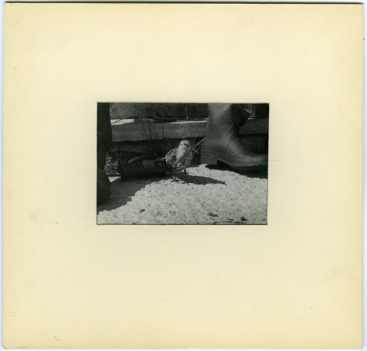 'Bildtext: ''Kustsnäppa, nyss ringmärkt.'' :: Närbild på kustsnäppa stående i sanden, i bakgrunden stövelklädd fot. :: :: Ingår i serie med fotonr. 7083:1-55.'