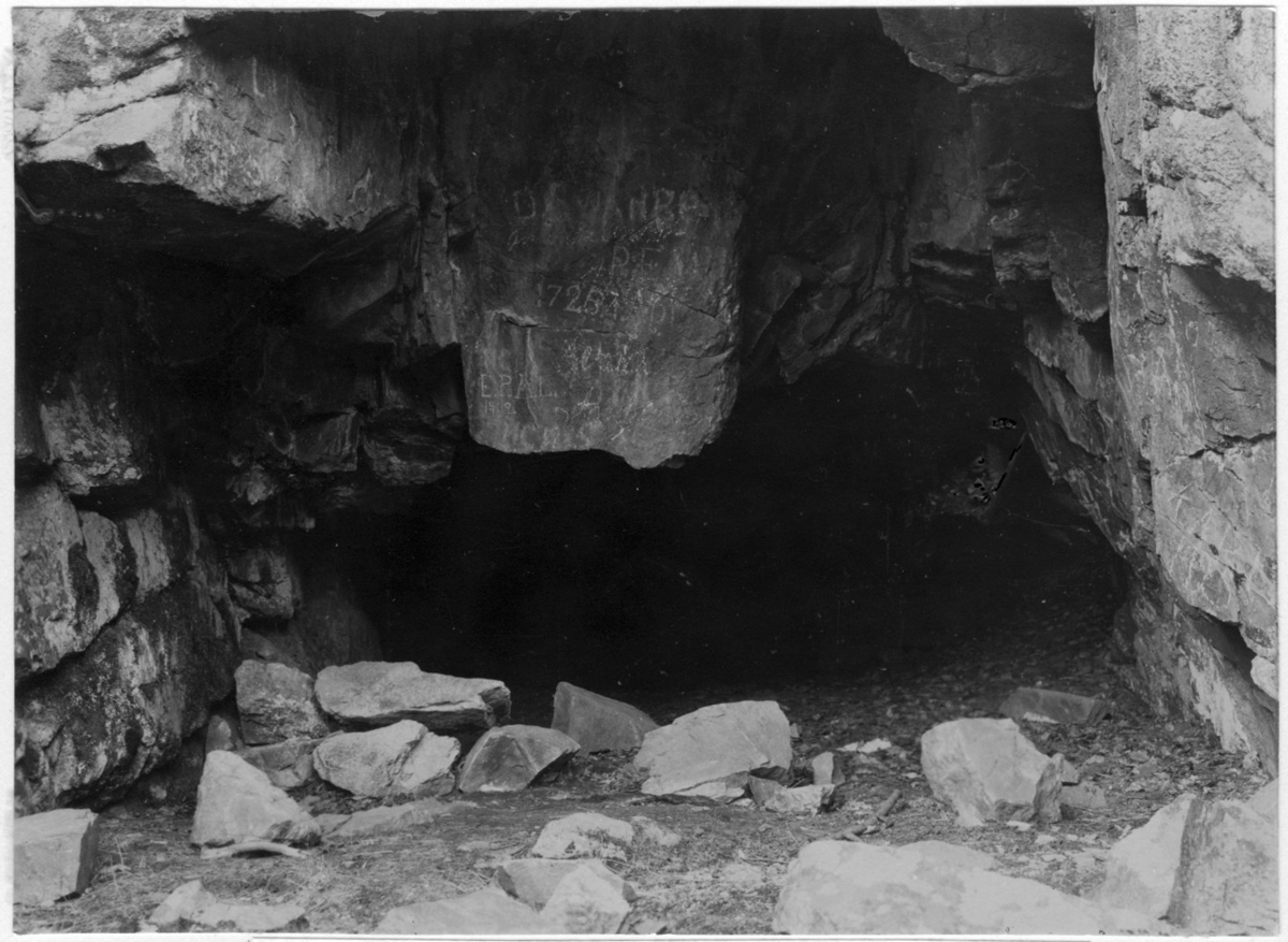 'Bildtext: ''Grottan Amundshålan eller Frilleshillern.'' Närbild på grottöppningen. Inskriptioner på berget i öppningens ''tak''. :: :: Fotonr. 7046:85-118 indelade som ''Geologiska bilder från Göteborgs- och Bohus län.'' Ingår i serie med fotonr. 7046:1-383, 7047:1-33 och 7048:1-67 med bilder från Länsjägmästare John Lindners bildarkiv.'