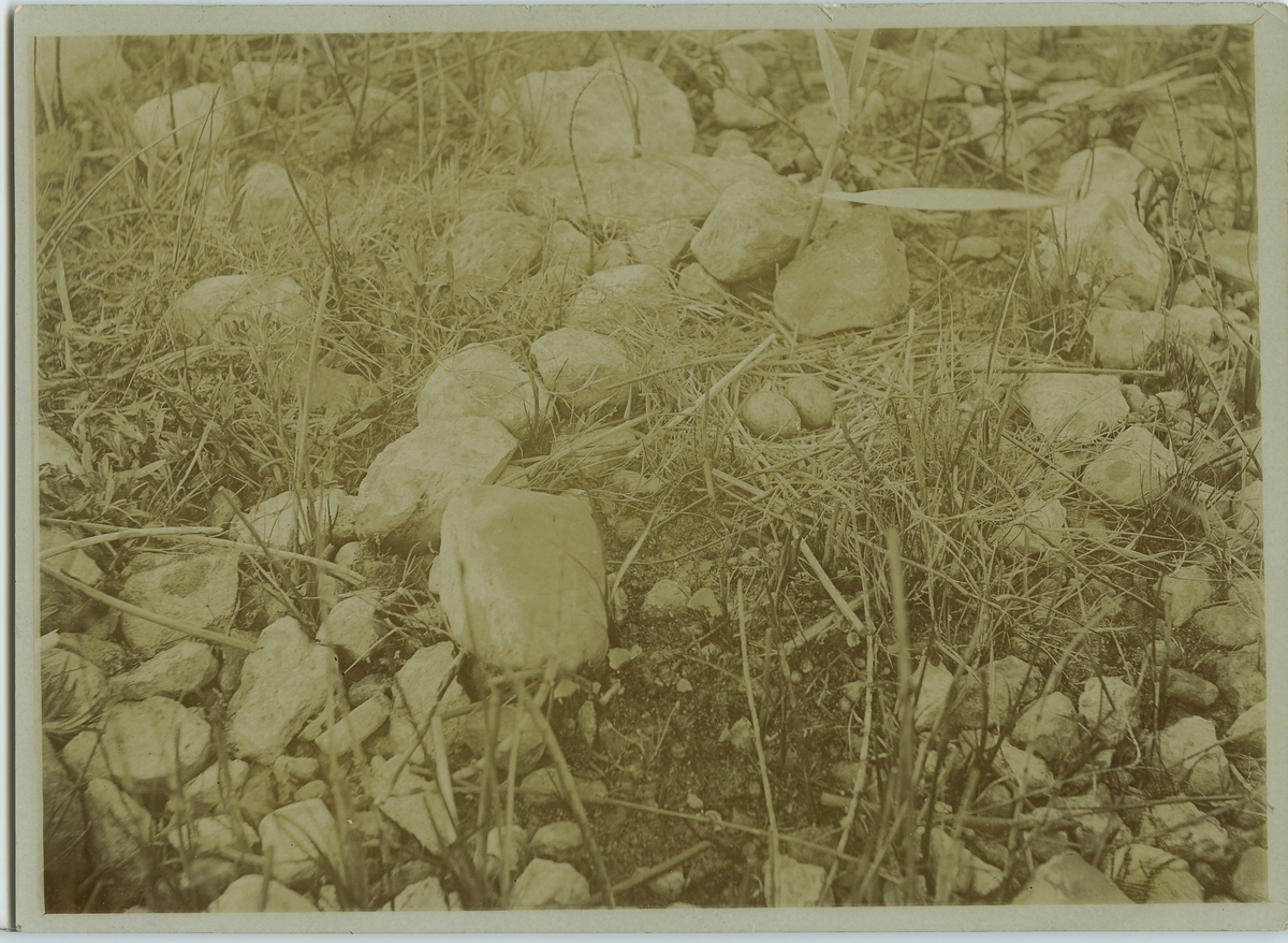 'Svarttärna?, bo med 2 st ägg på marken bland stenar. :: Enligt bildtext: ''Äggen något mindre än vanliga tärnan och med en vattenfärg, som mera brunt än i bredvidliggande bon. Det fanns dessutom ett par svarta tärnor, som vara mycket närgångna, då foton togs. Som häckplats för svart tärna, skulle ju foton vara stridande mot deras natur''. :: Trrerligare bildtext: ''Ej svart tärna, bomaterialet alldeles för grovt'' = Paul Henricis anmärkning.'' :: :: Ingår i serie med fotonr. 96-105.'