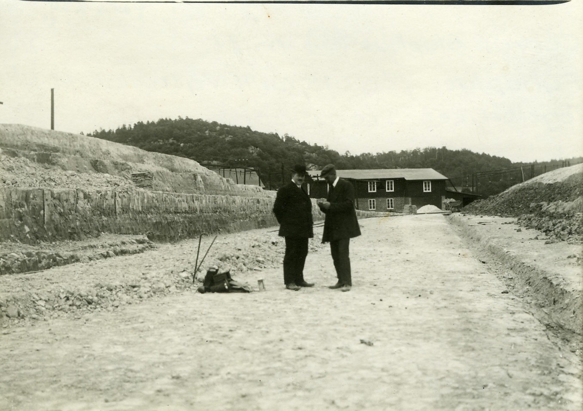 'Vy över fyndplatsen av Göteborgs Naturhistoriska museums subfossila kronhjortshorn. Fynddatum: 1913-06-00. Med på bilden finns 2 män stående på en väg i tegelbruket. I bakgrunden skymtar en stor byggnad samt skog. :: :: Se fotonr. 269:1-3. Se även fotonr. 620, 4478 och 1044.'