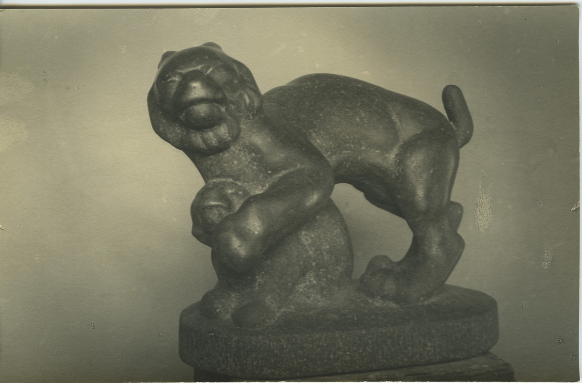 'Logrupp (i slipad granit). Skulptur av Richard Mäntynen. Storlek 40 x 37 cm, pris 600 kr. :: :: Serie fotonr 972-982 av stiliserade djurskulpturer.'