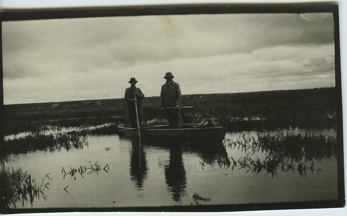 'Tobi Tourunen och forstmästare Henry Hackman stående i roddbåt. Vy över sjö med vegetation, vass. I fonden syns hus. :: :: Serie fotonr 953-971.'