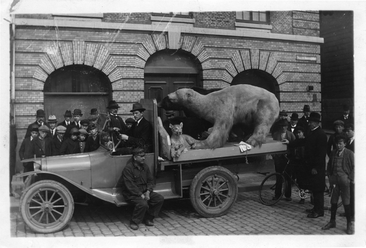 'Zoologiska avdelningens flytt: :: :: Isbjörnen under flyttning. Isbjörnen stående på ett lastbilsflak till liten lastbil. Kring bilen folksamling, barn, vuxna. I man med cykel. :: :: Se fotonr. 755-756.'