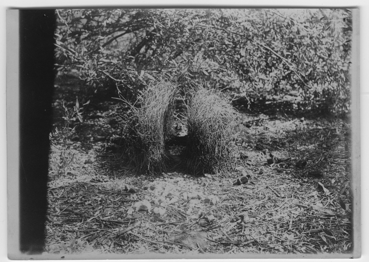 '''Lövsal'', lekstuga. På baksidan av det ena exemplaret står ''Materialet utanför lövsalen ben, frön, fruketer, kolbitar och en och annan glasbit. På marken omkring eucalyptusblad. Detta träd överskuggar platsen. Denna lövsal hemförd och exponerad i Göteborgs nya museum 1923. Fotot är taget ''in situ'' i västaustraliens savannskog nära kusten av King Sound (Derby). Obs! lekreden inne i gången (gav anledning till lösningen av lövsalens problem!)'' :: Lövsalen återfinns i monter 101A på Göteborgs Naturhistoriska museum (2006-10-24) :: :: Jämför 840, 1157-1158 samt 4287. :: :: Finns i monter 101 A på Göteborgs Naturhistoriska museum (2006-10-12) :: :: Ingår i serie med fotonr. 817-841.'