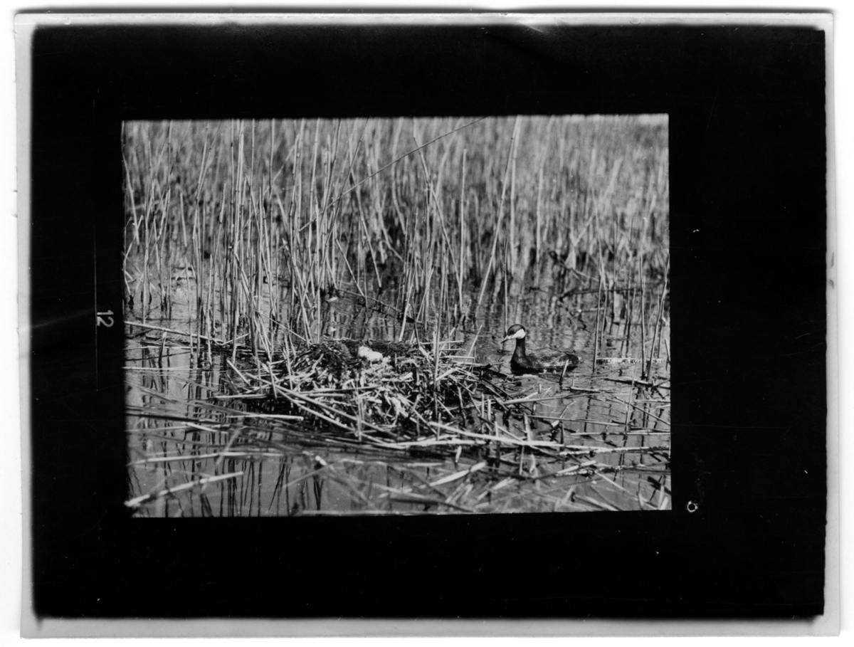 'Gråhakedopping simmande intill boet med ägg. :: :: Ingår i serie med fotonr. 1661-1689.'