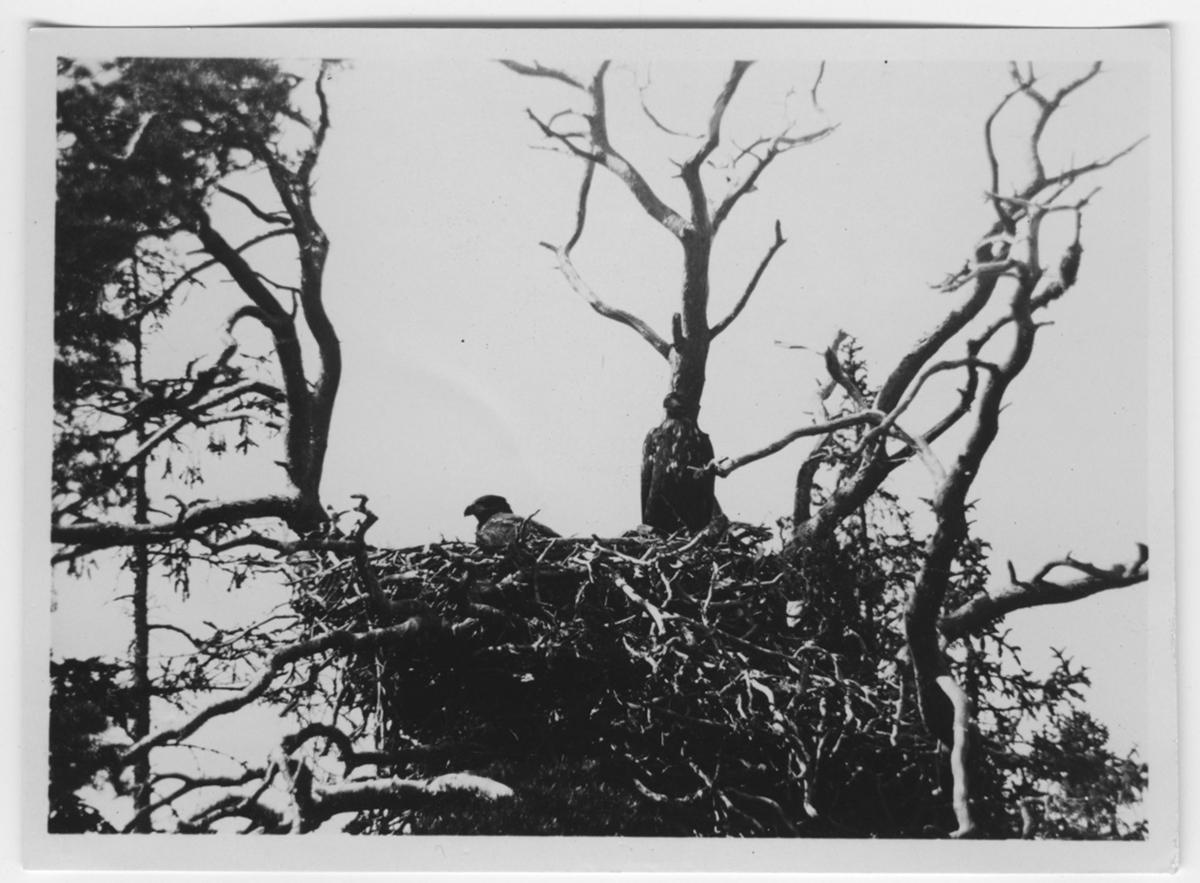 '2 st unga havsörnar i boet. Boet i tallkrona. :: :: Ingår i serie med fotonr. 1771-1837. Se även fotonr. 3151-3200.'