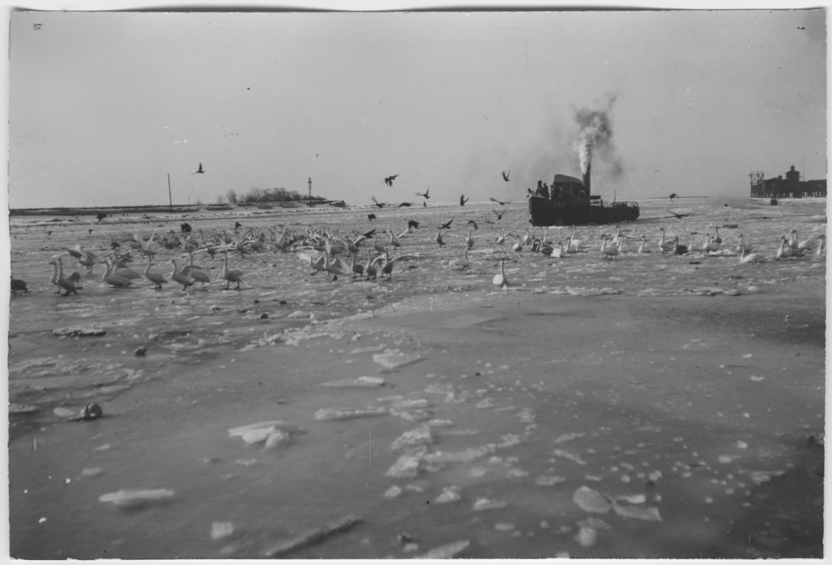 'Svanar i Landskrona hamn, på is. Större båt med besättning. I bakgrunden land med brygga och byggnader. :: :: Se fotonr. 1358-1368, 1430, 2544-2545 samt 945-950, samma motiv samma år.'