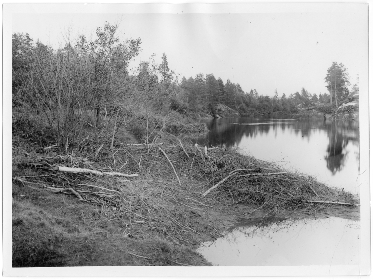 'Bäverhydda, dubbel, längre bort syns en tredje hydda. Vy med sjö. Berghällar, tallar och buskar. :: :: Ingår i serie med fotonr. 1738-1749.'