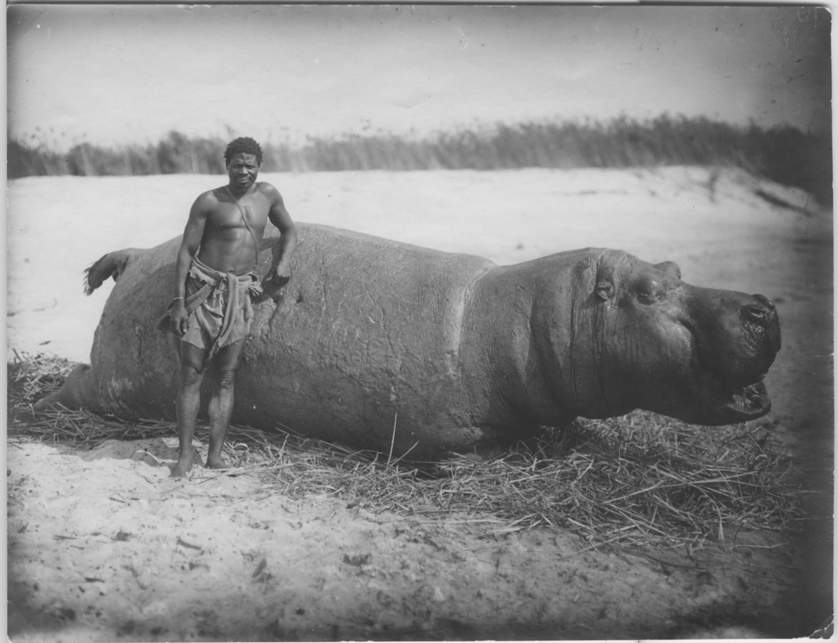 'Död flodhäst liggande på stranden, 1 man stående framför i höftbeklädnad. :: :: Ingår i fotoserienr 149-155.'