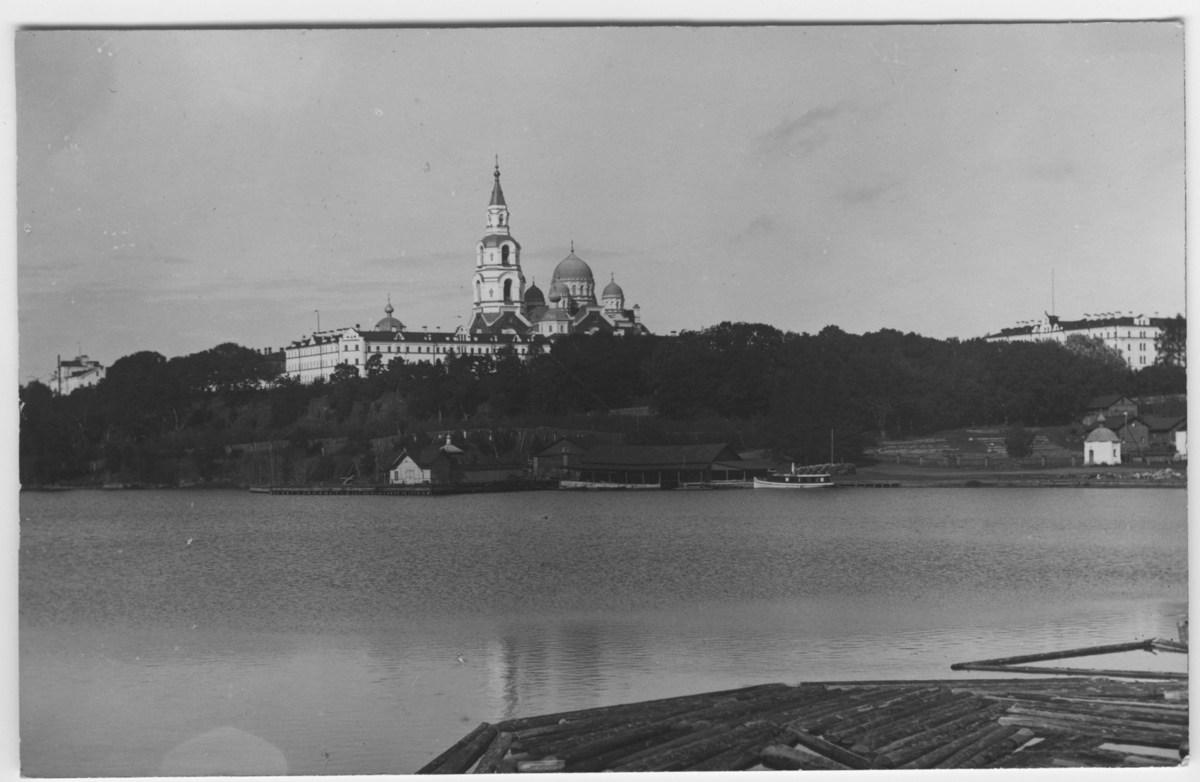 'Vy med utsikt från vatten in mot Valamo kloster. :: :: Ingår i serie med fotonr. 1190-1200, inköpta av Leonard Axel Jägerskiöld sommaren 1927.'