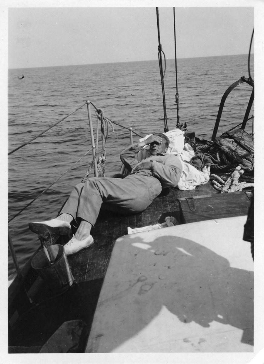 'Akka-expeditionen sommaren 1930: :: :: Redaktör Claes Krantz ligger på däck ombord på Akka, på väg från Anholt till Träslöv. :: :: Ingår i serie med fotonr. 2033-2087.'