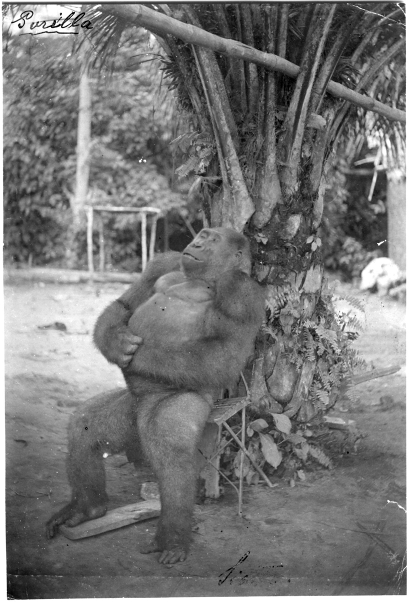 'Gorilla, hane, uppspänd på stol under en palm. :: :: Ingår i serie med fotonr. 1975-1997.'