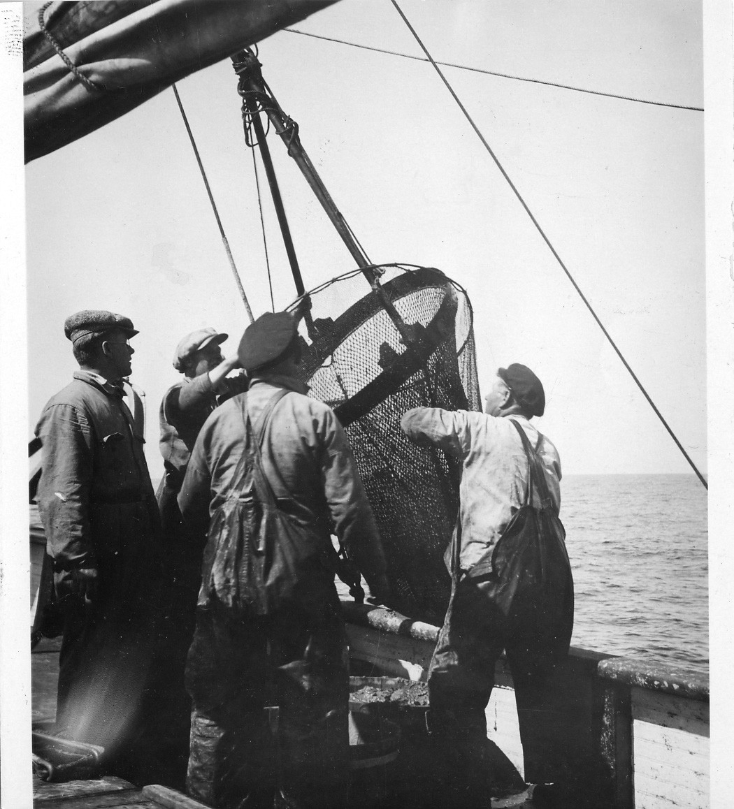'Akka-expeditionen sommaren 1932: :: :: 4 st män på däcket i färd med att ta upp Stora ringen (Station 108). :: :: Ingår i serie med fotonr. 2400-2453.'