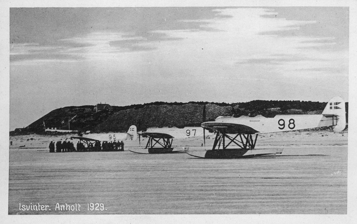 'Bildtext: ''Isvinter'', 3 st mindre flygplan på is. En grupp människor samlade vid det bortersta flygplanet. :: :: Ingår i serie med fotonr. 2167-2179.'