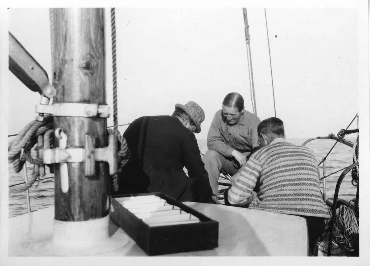 'Akka-expeditionen sommaren 1930: :: :: Från vänster: överste A. Arbin, kapten K. Lennman och adjunkt Anders Wastensson / Anders Wastenson (till höger, ryggen) spelande bridge under färd från Träslöv till Nidingeknölen, på däck. 3 män på däck. :: :: Ingår i serie med fotonr. 2033-2087.'