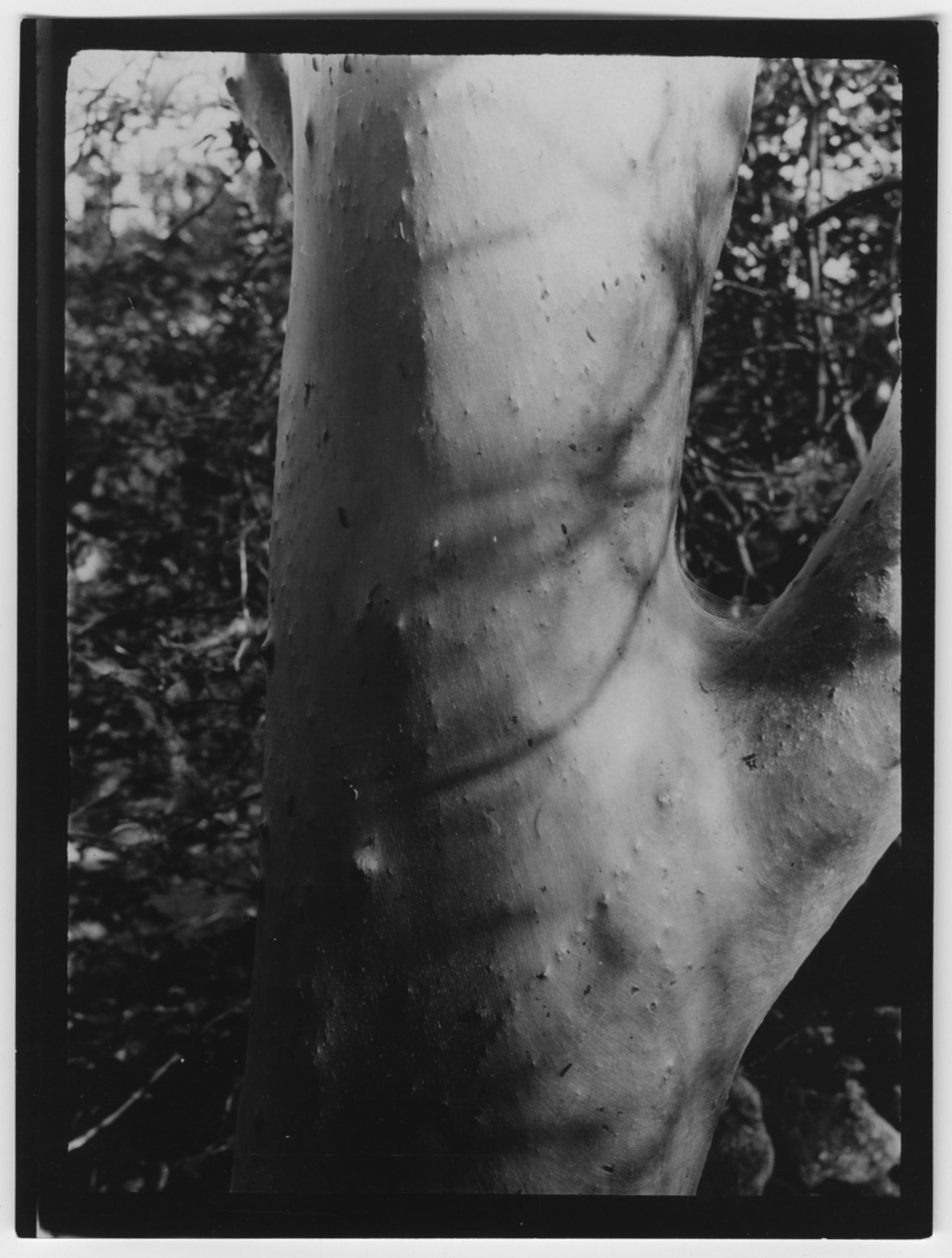 'Närbild på stam av hägg angripen av häggspinnmalen. Text på baksidan: ''Häggstam omspunnen av häggspinnmal.'' :: :: Ingår i serie med fotonr. 2347-2399.'