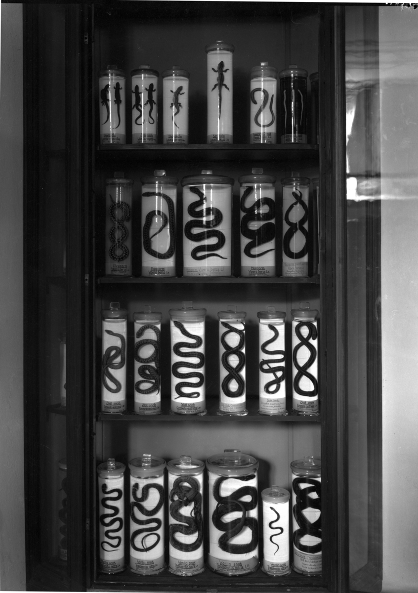 'Monterskåp med ormar och ödlor i glasburkar med glaslock. :: Översta hyllan: Skogsödla, sandödla och kopparorm/kopparödla. :: Andra hyllan ovanifrån: Huggormar :: Näst nedersta hyllan: Slät snok :: Nedersta hyllan: Vanlig snok :: :: Ingår i serie med fotonr. 2735-2769.'