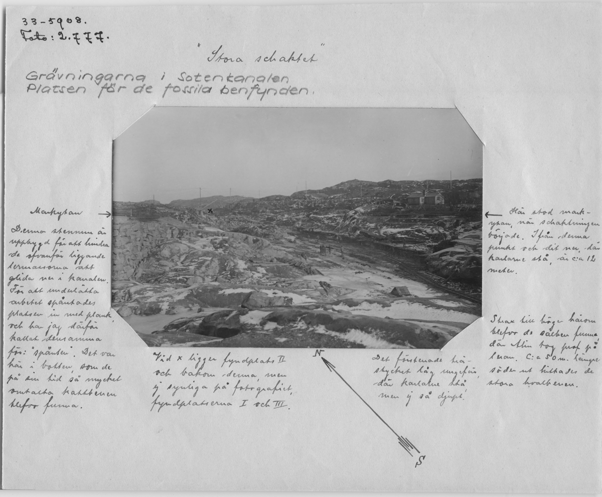'Från grävningarna i Sotenkanalen: platsen för de fossila benfynden. Stora schaktet''. Fyndplats II vid x-markeringen på fotografiet. :: :: Vy över grävplatsen med ca 10 människor stående och 1 litet hus. Mer bildtext på fotografiet. :: :: Serie fotonr 2773-2778, bilderna är monterade på papper som har utförlig text.'