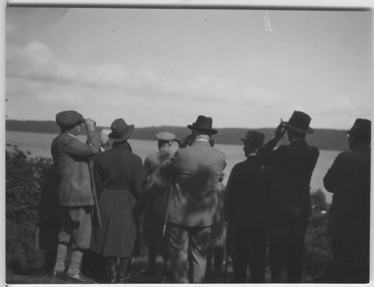'Biologiska förenings utfärd till Fjärås-Onsala-Nidingen-Malön-Kalvön: :: :: Ryggarna på 9 st hattklädda män med kikare, med sjön Lygnern i bakgrunden, bl.a. Leonard Axel Jägerskiöld, Björn Wennerberg. :: :: Se fotonr. 2489-2500 och 2501-2515 från samma utfärd.'