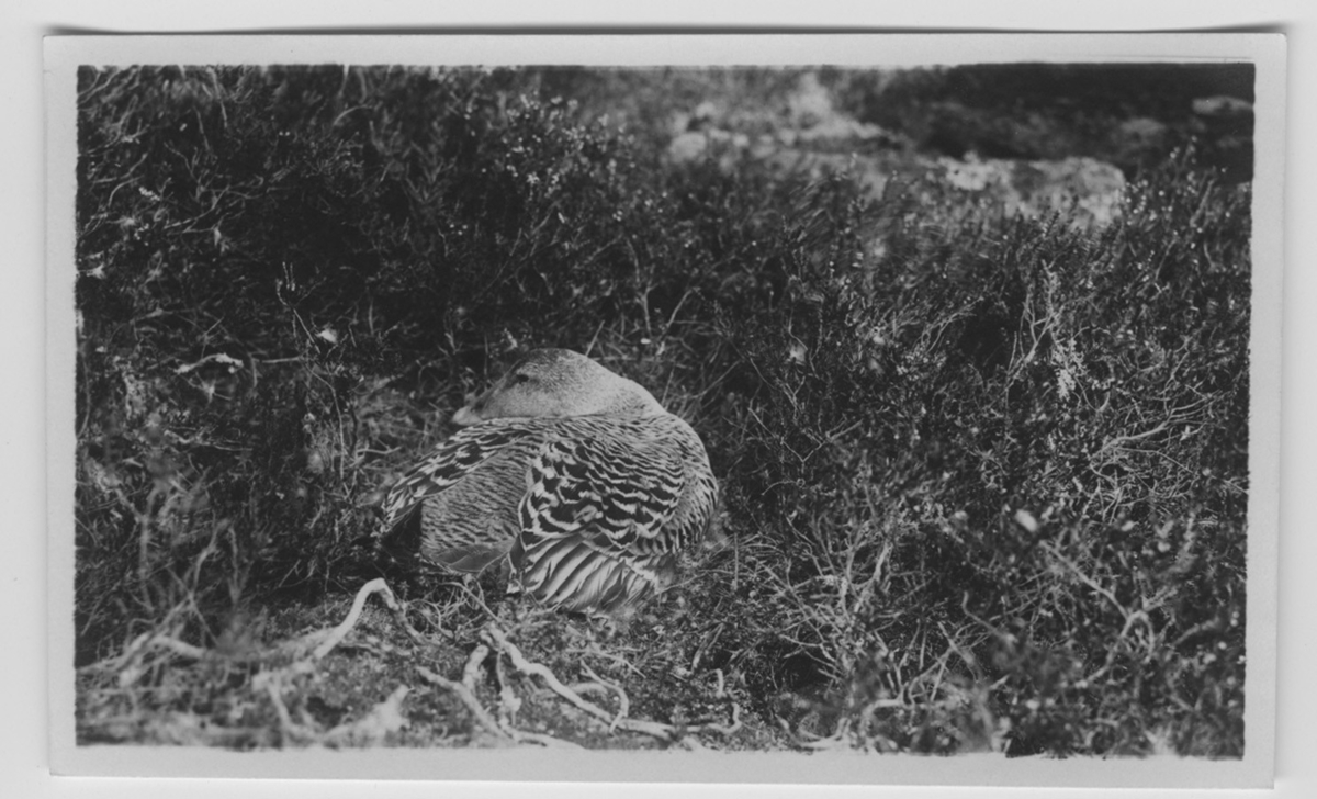 'Ruvande åda, vuxen ejderhona. Närbild balnd ljungris. :: :: Se serie med fotonr. 3151-3200. Se även fotonr. 1771-1837.'