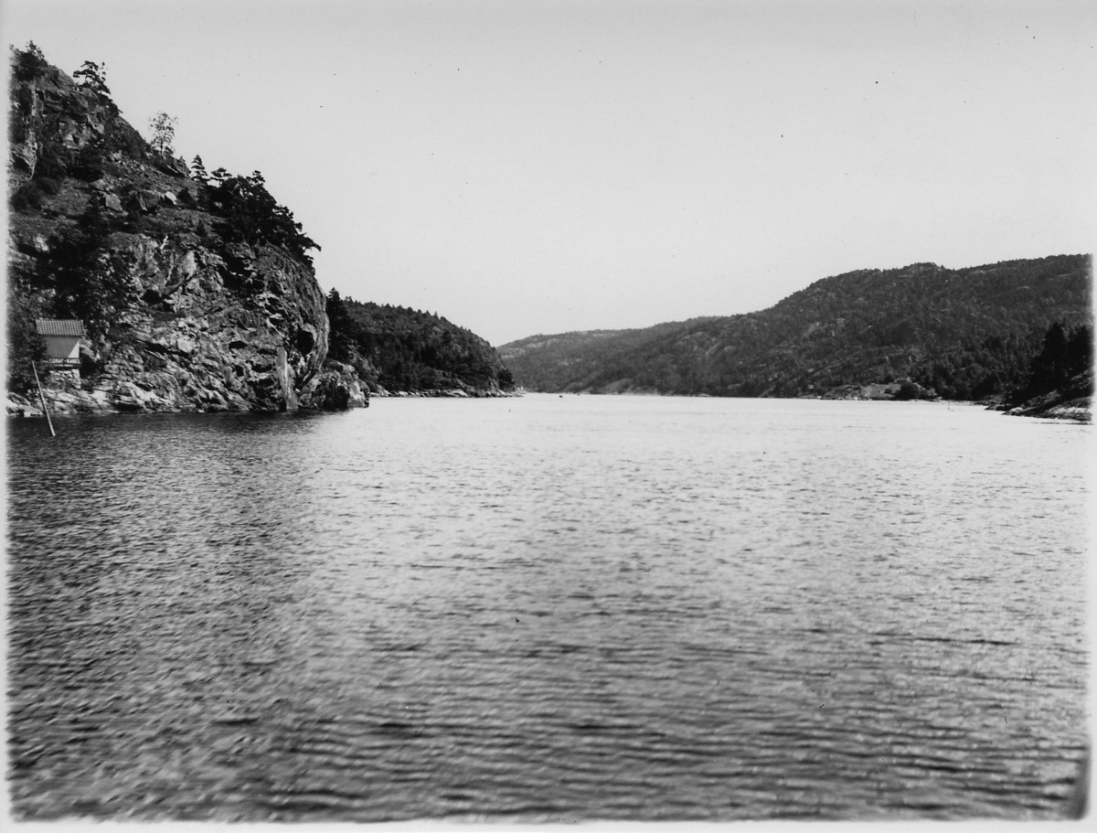 'Naturhistoriska muséets Skagerackexpedition med båten Skandia sommaren 1934: :: :: Svinungsund, vy från havet in i sundet med berg på sidorna. Liten träbyggnad till vänster. :: :: Ingår i serie med fotonr. 3309-3317.'