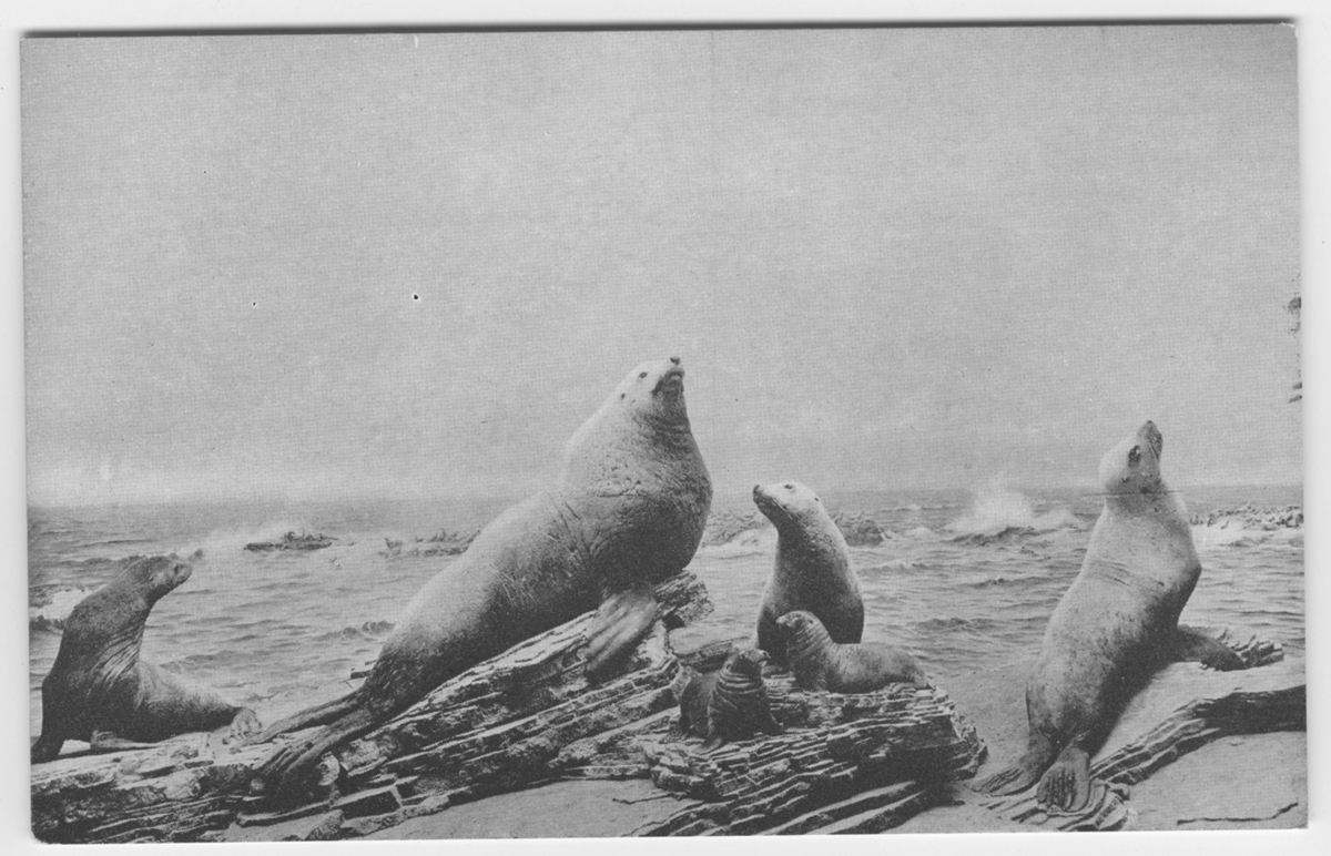 'Grupp med 6 sjölejon vuxna och unga på stenhällar. Vy med hav. Text på baksidan: ''Steller's sea lion group.'' :: :: Ingår i serie med fotonr. 2915-2929, se även fotonr 2914:2.'