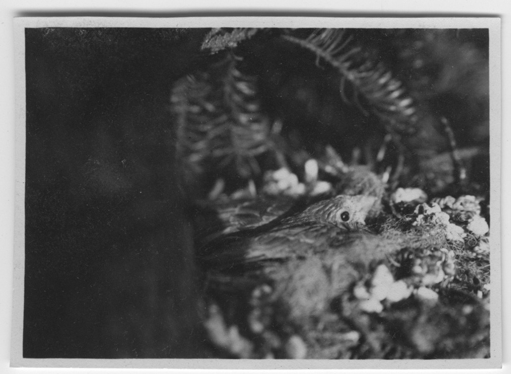 'Unge, hona, av större korsnäbb i boet, grankvist synlig. :: :: Se även fotonr. 3420.'