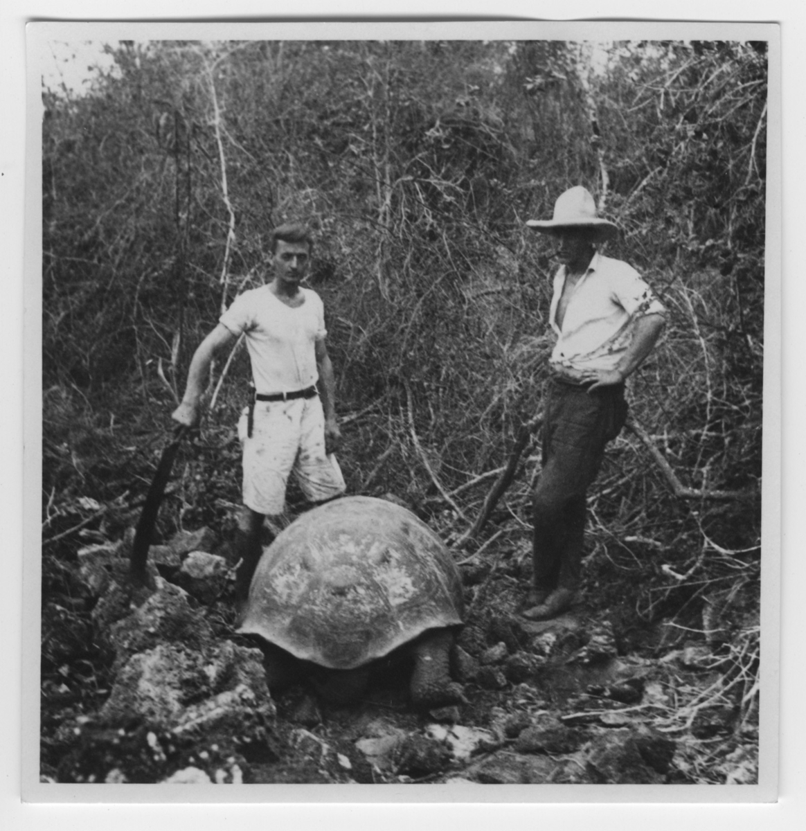 '1 jättesköldpadda mellan 2 män. :: :: Se serie med fotonr. 3779-3822.'