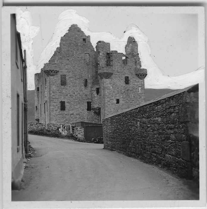 'Från ''Skageraks''-expeditionen till Hebriderna och Shetland: :: :: Väg med stenmur på ena sidan och stenbyggnader på andra sidan. I centrum, en ruinbyggnad, slottsruin, med bl.a. hängtorn. Enligt anteckning på baksidan av fotografiet: '' Scalloway castle''. Fotografiet är maskerat. :: :: Ingår i serie med fotonr. 4111:1-43.'