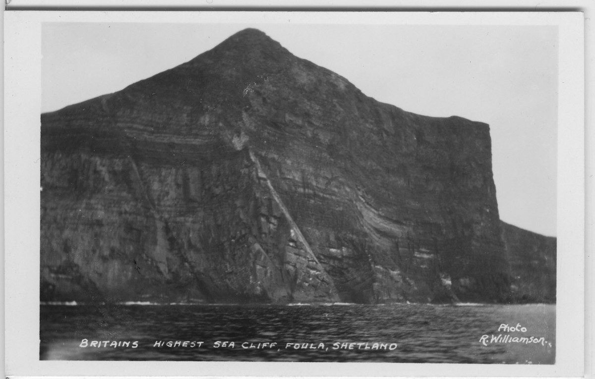 'Från ''Skageraks''-expeditionen till Hebriderna och Shetland: :: :: Klippa, klippvägg vid havet. Bildtext: Britains Highest Sea Cliff, Foula, Shetland. :: :: Ingår i serie med fotonr. 4113:1-82.'