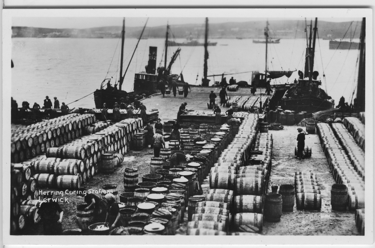 'Från ''Skageraks''-expeditionen till Hebriderna och Shetland: :: :: Sill station, silltunnor liggande på hög, båt, människor. Bildtext: Herring Curing station, Lerwick. :: :: Ingår i serie med fotonr. 4113:1-82.'