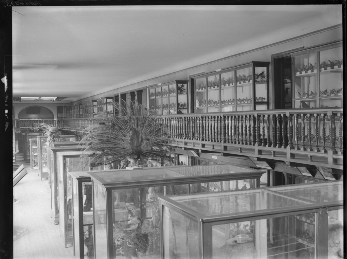 'Interiörer från Zoologiska avdelningen på Göteborgs Museum i Ostindiska huset. :: :: Vy över glasmontrar fotograferade ovanifrån, påfågel bl.a. synlig. Även balkong med räcke synlig. Monterade fåglar i skåpen. :: :: Ingår i serie med fotonr. 4273:1-3.'