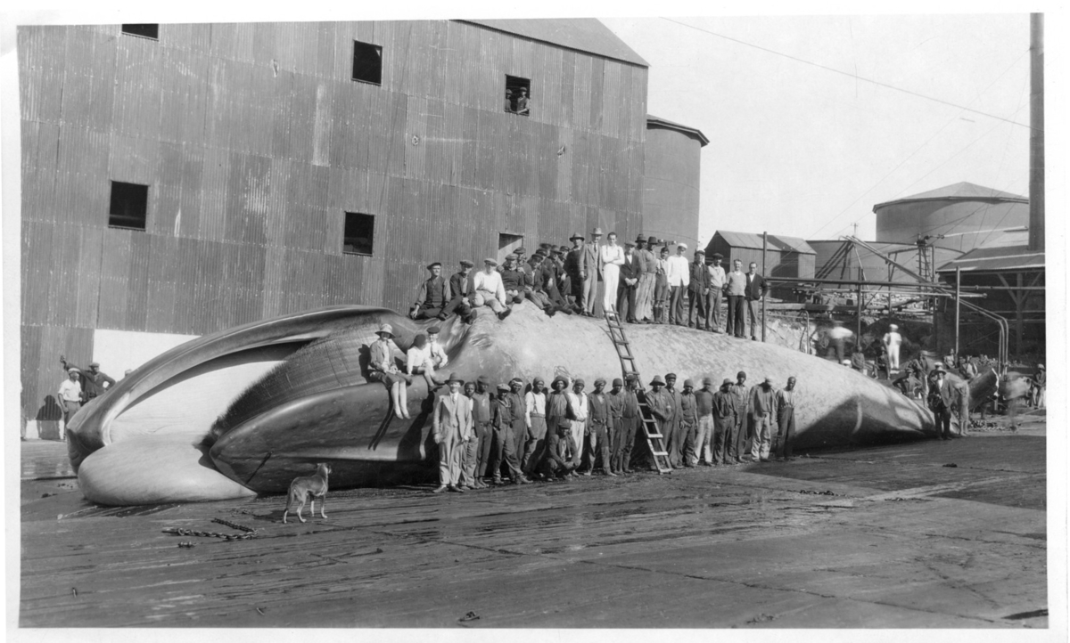 'Blåval, på kaj, med människor både på och framför. :: Samma som fotonr 1471, annan vinkel. Se även fotonr. 1472. :: Längd 87 eng.fot. :: Det har utvunits 250 fat olja ur valen. :: 6 fat=1016 kg. (enligt text på baksidan av fotografiet)'