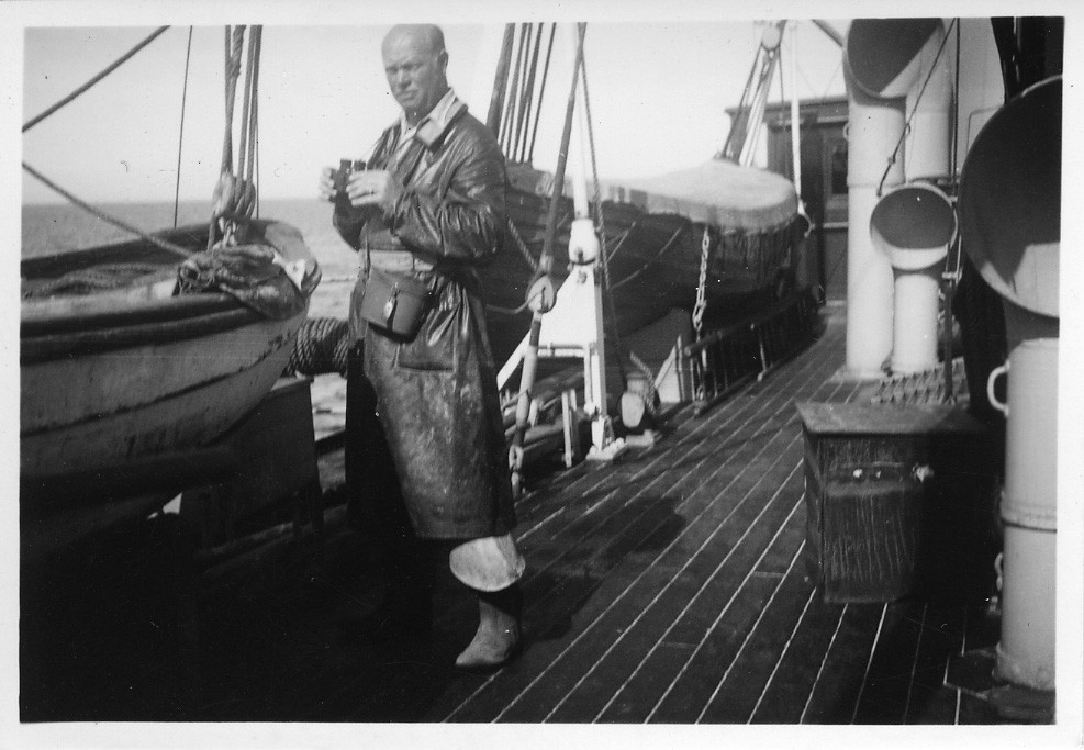 'Från Göteborgs Biologiska förenings expedition med ''Skagerak'': :: :: 1 man på däck med kikare. På båtdäcket syns 2 livbåtar. :: :: Ingår i serie med fotonr. 3934-3953 med foton från Göteborgs Biologiska förenings expeditioner.'