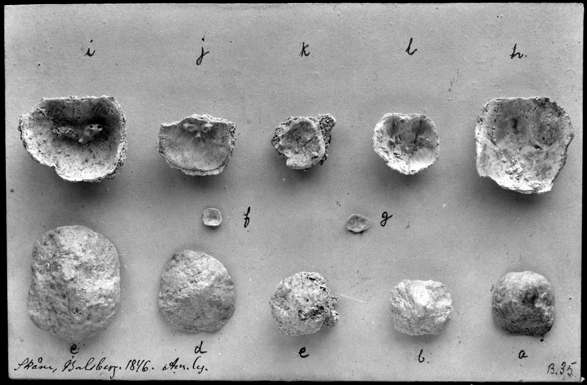 'Snäcka, fynddatum: 1846-00-00 (h ?) bild på 10 st som är markerade med bokstäver a-l. Fyndlokal Skåne, Balsberget. :: :: Ingår i serie med fotonr. 3957-3967 med foton av August Wilhelm Malms samling av kritfossil från Kristianstadstraken.'