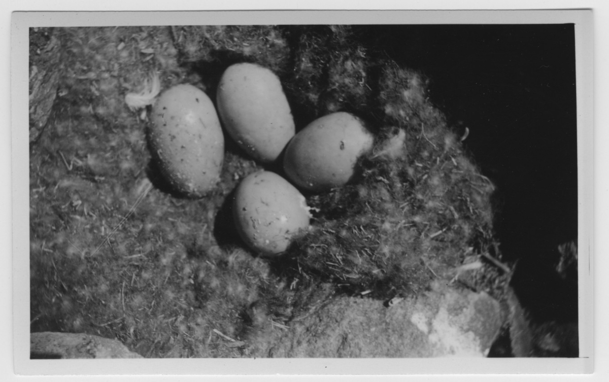 'Ejderns bo med 4 st ägg i ett stenrös. Exkrementer från honan syns tydligt. :: :: Ingår i serie med fotonr. 4500:1-172.'