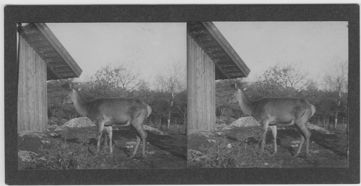'Kronhjort, hind, intill träbyggnad. :: :: Ingår i serie med fotonr. 440-448.'