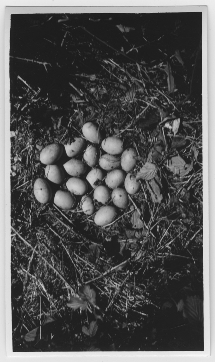 'Bo med 19 ägg. Enligt bildtext: ''Bo med 19 nyvärpta ägg gömt under tät björnbärsbuskage, borttaget för fotografering.'' Närbild. :: :: Ingår i serie med fotonr. 4401-4440.'