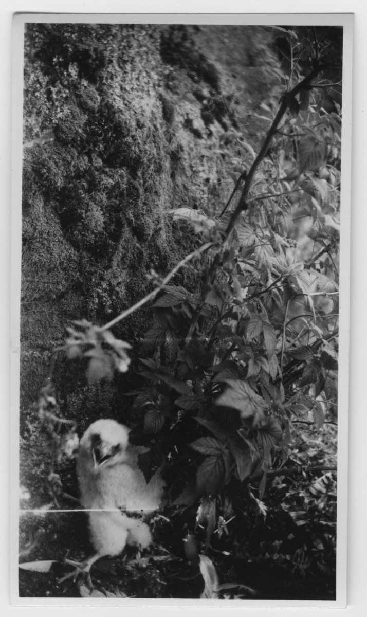 'Närbild på pilgrimsfalkunge, hona, invid hallonbuske, intill bergvägg. :: :: Text på baksidan av fotot: ''Honan skriker ilsket mot kameran i skydd av hallonbusken. Fotot taget med 90 cm lins.'' :: :: Ingår i serie med fotonr. 4500:1-172.'