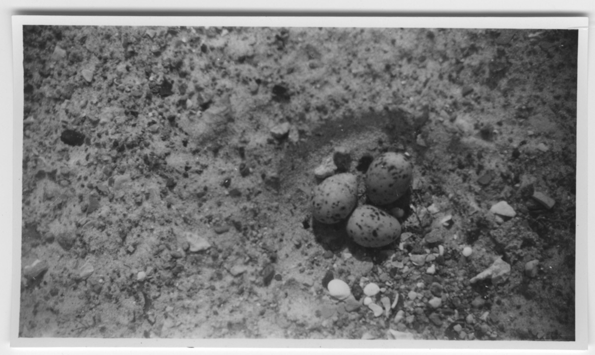 'Bo med 3 ägg på en sandrevel. Fläckiga ägg liggande i sand bland musselskal och småsten. :: :: Ingår i serie med fotonr. 4401-4440.'