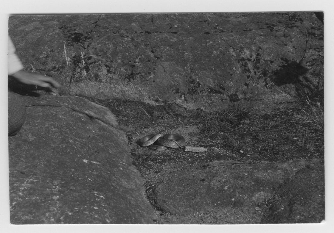 '1 pilsnok ligger ihopringlad invid bergshällar. Vanlig i norra Italien och på Balkan. :: :: Ingår i serie med fotonr. 4501:1-60 ur ingenjör Otto Cyréns ''Ormar i fantasi och verklighet''. Del av bilden med på sidan 159 i verket.'