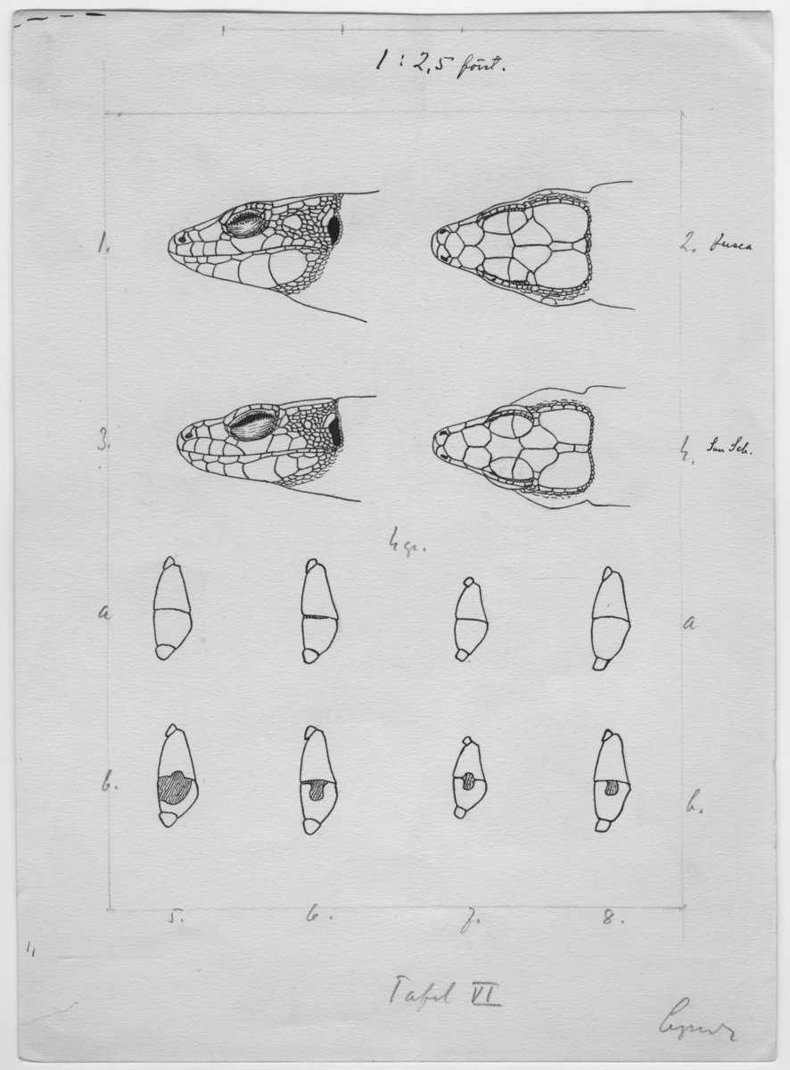 'Teckningar av huvud hos ödla. 1:25 förstoring. Tavla 6. :: :: Fotonr 4505:1-9: Fotografier över diverse ödlor ur Ingenjör Otto Cyréns ''Spanische und portugiesische Mauereidechsen''. Meddelande från Göteborgs Museum Zoo.46 + 2 teckningar.'