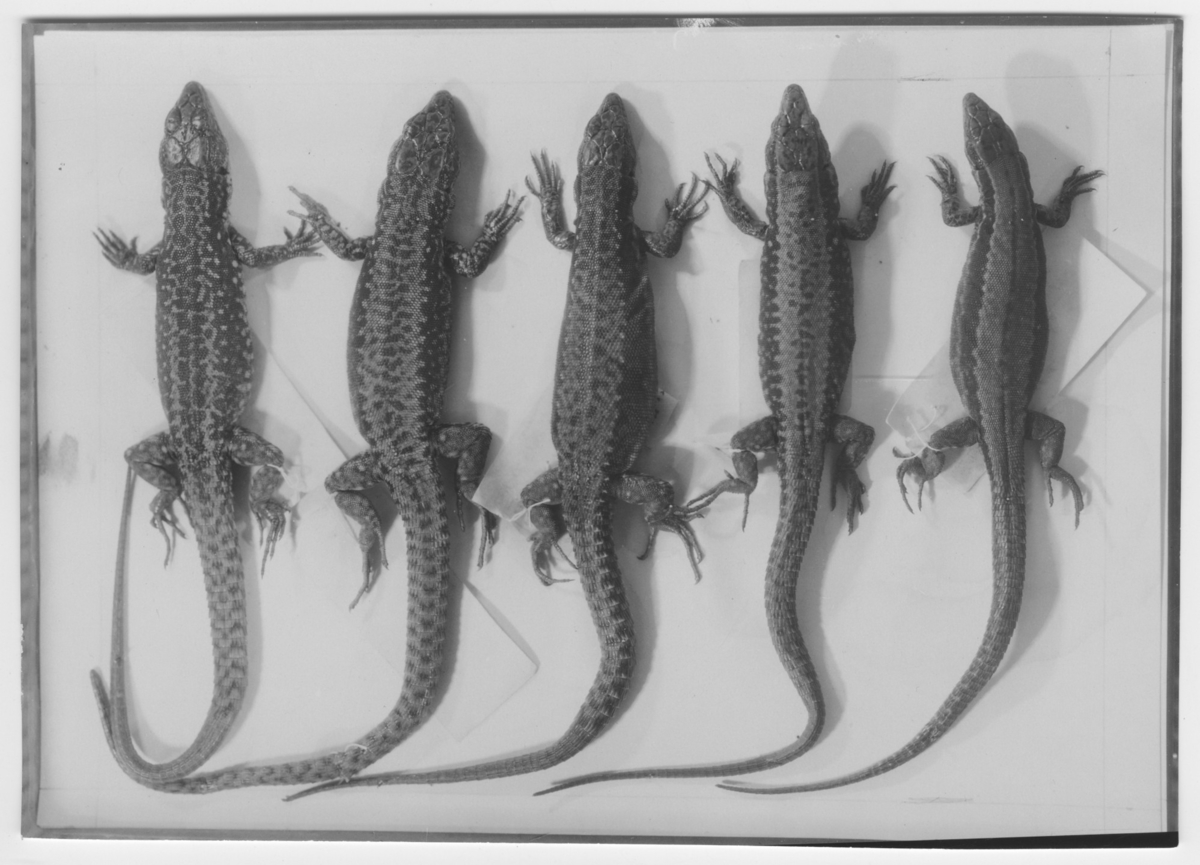 '5 st ödlor sedda från ryggsidan. :: :: Fotonr 4505:1-9: Fotografier över diverse ödlor ur Ingenjör Otto Cyréns ''Spanische und portugiesische Mauereidechsen''. Meddelande från Göteborgs Museum Zoo.46 + 2 teckningar.'