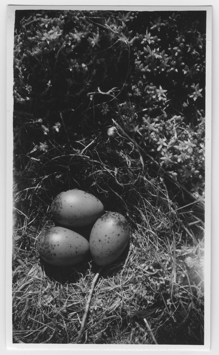 'Bo med 3 nyvärpta ägg, blommande fetknoppsväxt invid boet. :: :: Ingår i serie med fotonr. 4401-4440.'