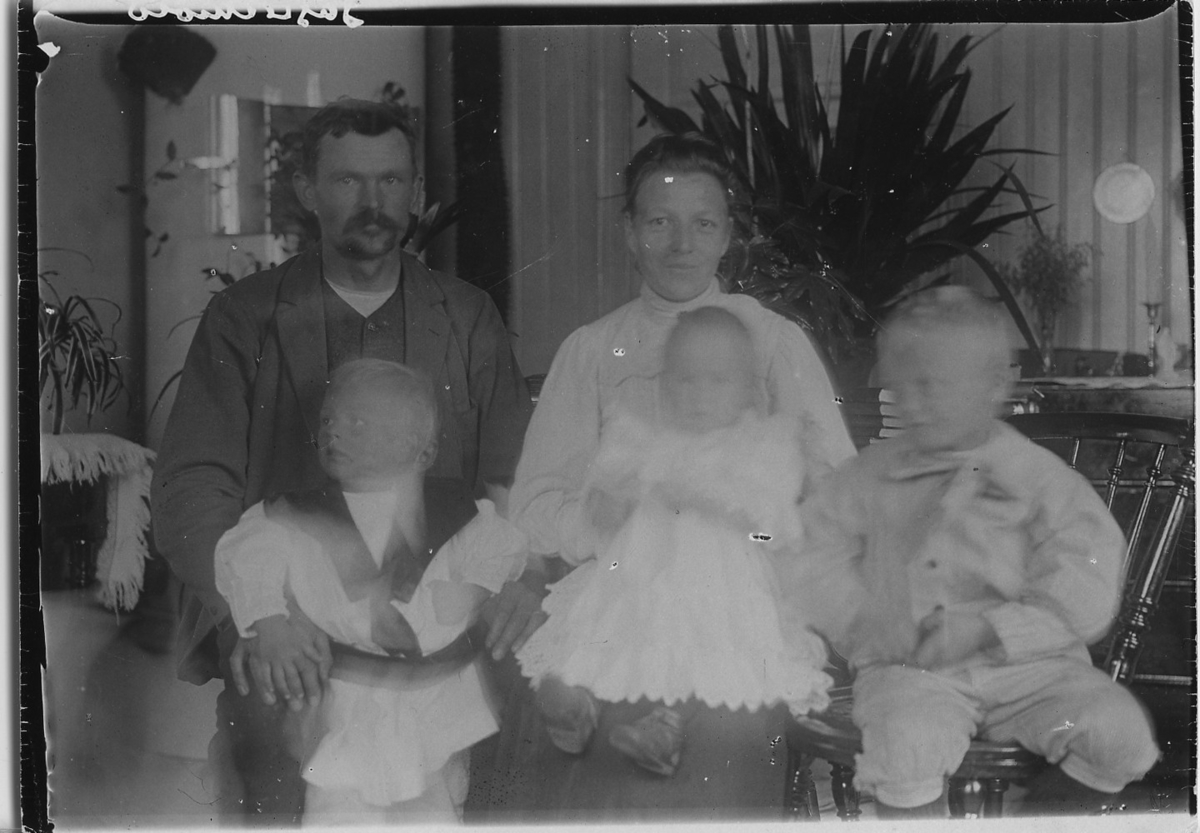 'Från Professor Leonard Axel Jägerskiölds ripjakter vid Fjällåsen. :: :: Familjeporträtt, enligt anteckning på fotografiets baksida: ''banförman Nykvist, Fjällåsen, med familj''. 1 kvinna, 1 man och 3 barn sittande i ett rum. :: :: Ingår i serie med fotonr. 4312:1-38.'